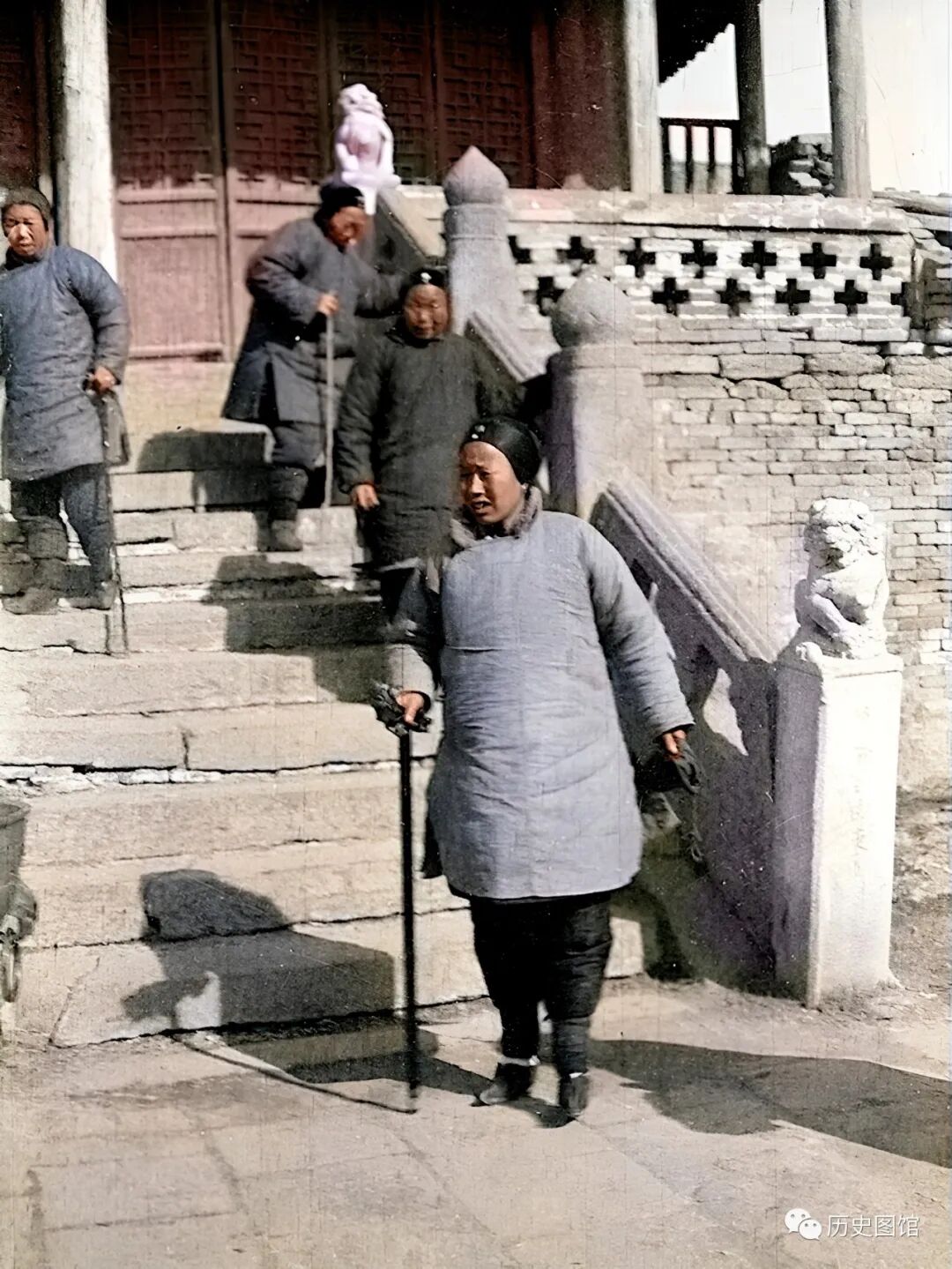 四位开封老太太,拄着拐杖来到龙亭游玩,可见当时龙亭的人气很旺。朱红的木门,青石台阶,石板铺地,处处显露着古朴和历史气息。