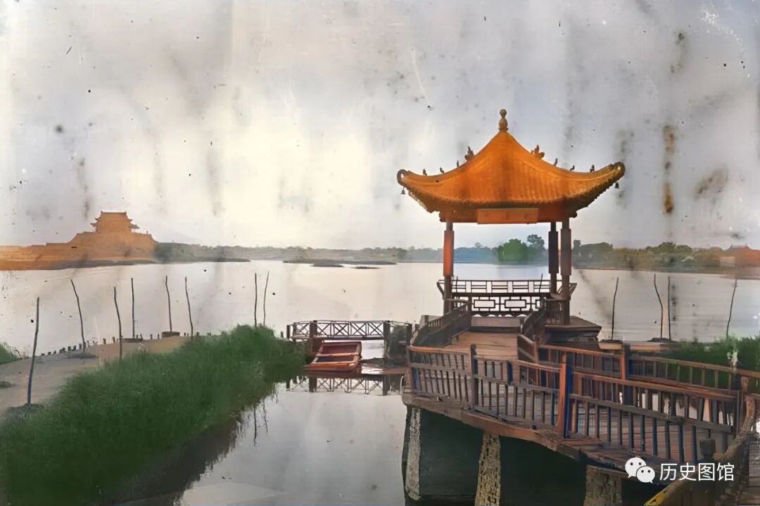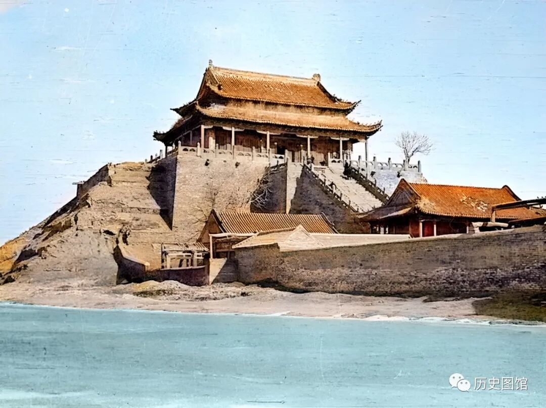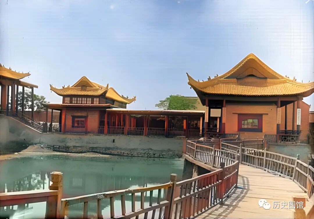 这是当时的开封龙亭,是建筑在一座13米高的青砖台基之上的大殿。重檐歇山式建筑,气势雄伟。登高望远,主干道两侧各有一个湖,分别为潘湖和杨湖。