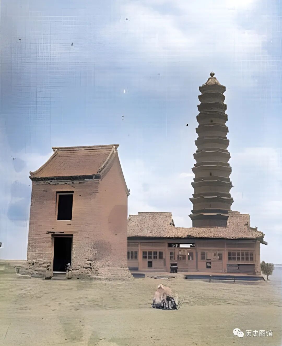 这是当时的开封繁塔,始建于北宋开宝七年(974年),原名兴慈塔,塔下有一座天清寺。因其兴建于繁台之上,俗称繁塔。它也是开封地区现存最古老的建筑之一。塔身四周密密麻麻的圆形小孔,每一个老雕刻有一个佛像。