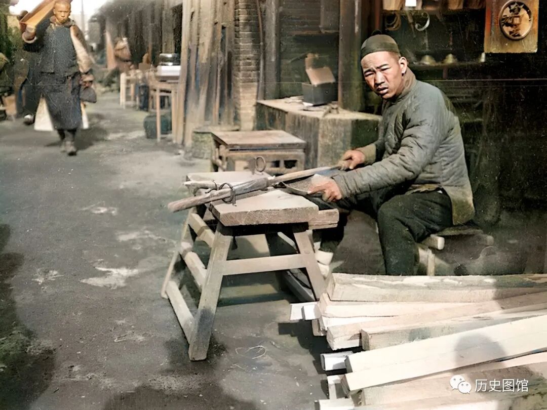 这是街边的一间修理铺,一名男子正坐在门前修整工具。照片反映的是开封老百姓的日常生活,很有市井气息。