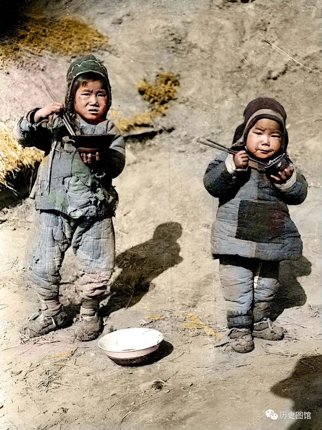 两名小孩正端着碗在院子外面吃饭。手里端着碗,地上放着一个盛饭的粗瓷大碗。可见,当时人们的生活条件很差,连桌子都没有。两个孩子身上穿的棉袄上有很多补丁。小小年纪,已经品尝到了生活的艰辛。