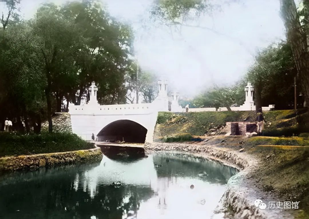 1922年,常盘桥的桥面进行了加宽,桥长11米,宽度达到了17米。桥两侧分别建了护栏和四座装饰柱子,柱子顶端立有铁艺仙鹤。照片拍摄于1927年。