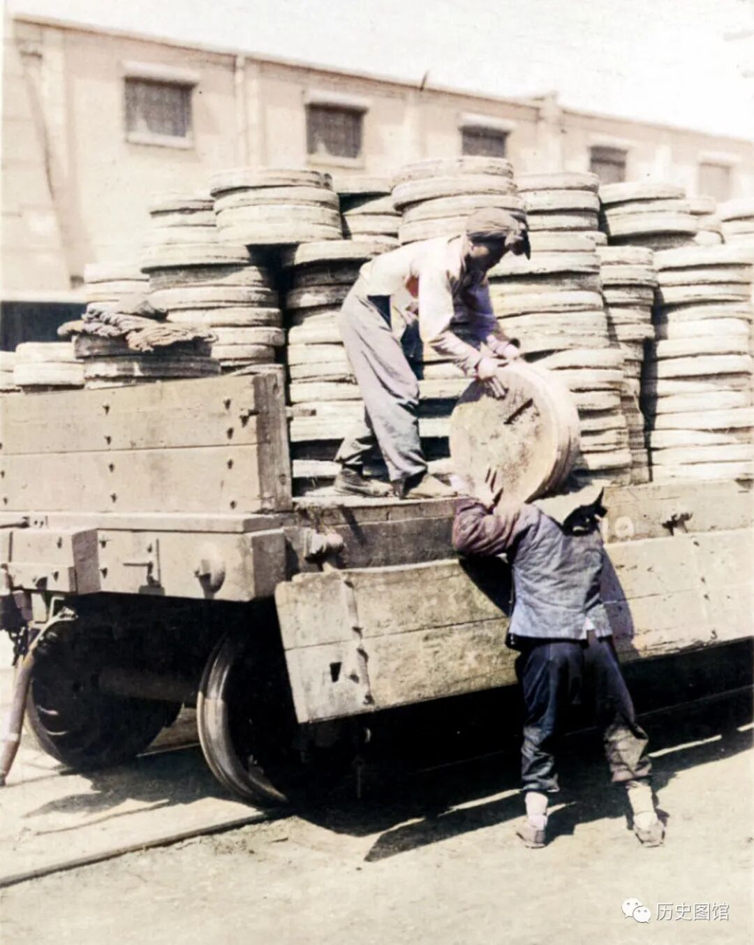 码头上的装卸工十分辛苦,干的是重体力活,他们两个人要把这一整车豆粕全部卸完。照片拍摄于1925年。