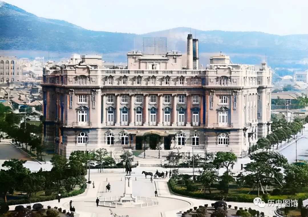 这座建筑,是大连的邮政局大楼,位于中山广场一侧。照片拍摄于1929年。