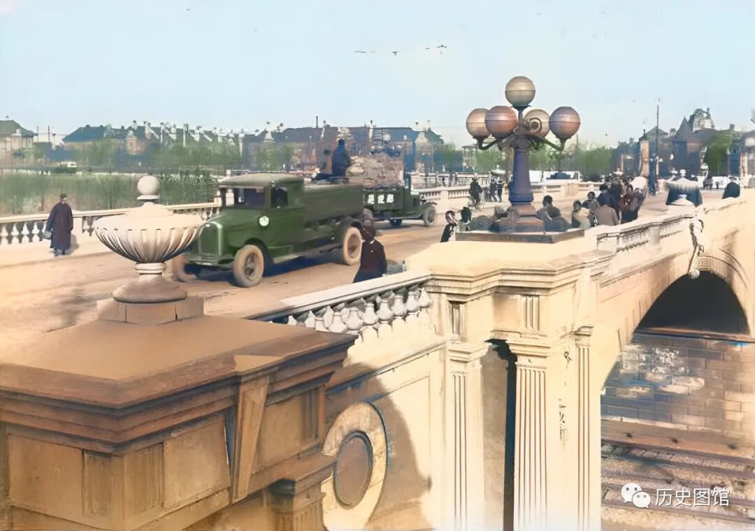 照片中这座桥,叫日本桥。位于今大连市西岗区胜利街与上海路交汇处。桥上有卡车和行人。