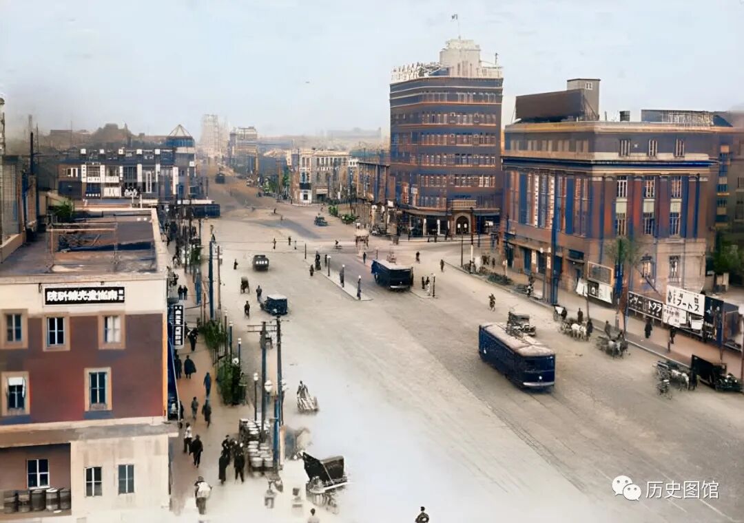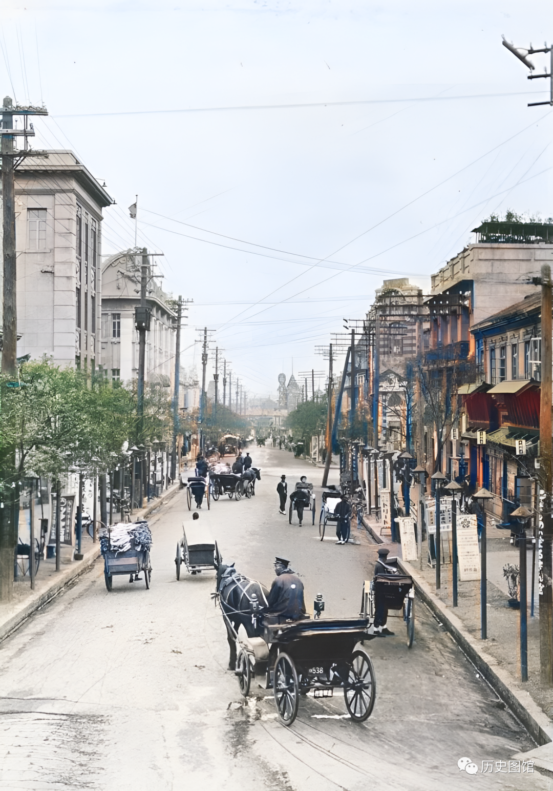这是一条繁华的街道,道路笔直,两侧的建筑为欧式。马车和黄包车不断从路上驶过。