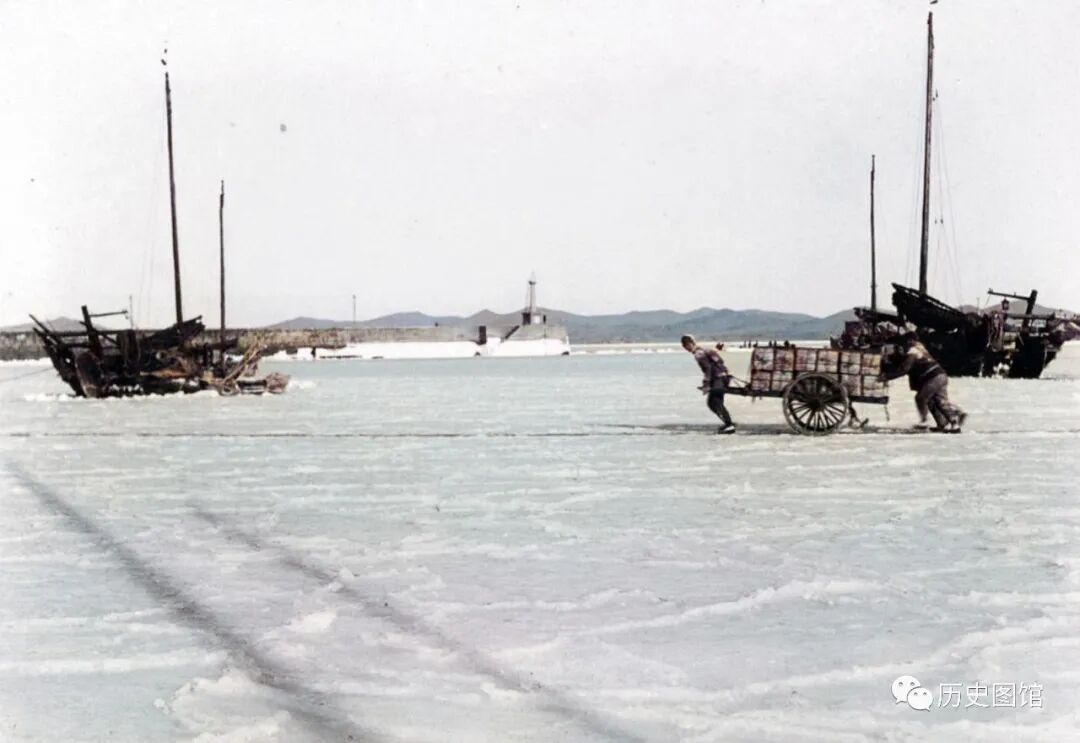 这里是大连靠海的一片盐田,位于大连普兰店貔子窝(今为皮口)附近。照片拍摄于1937年。