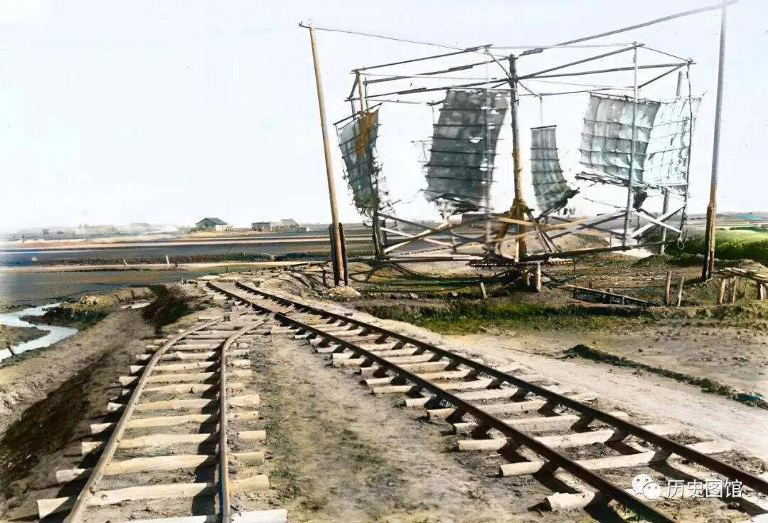 照片中那个简易装置是风车,风力带动风车旋转,就能把海水带进盐田。两条窄铁轨,可能是供车辆运输成品盐。