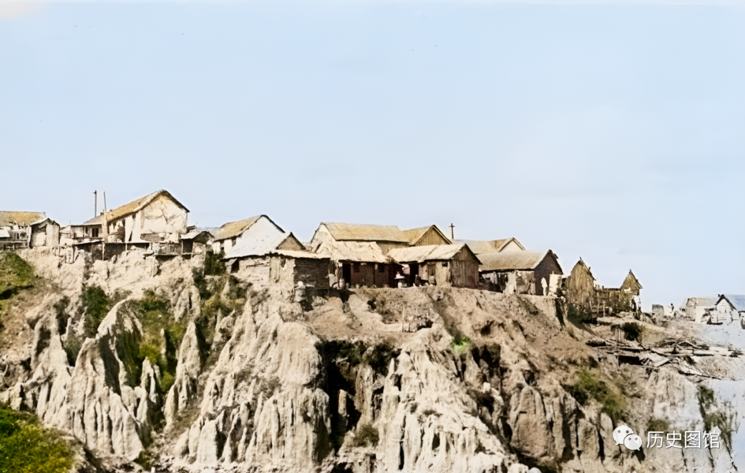 这是位于大连寺儿沟海岸沿线处的一座山崖上,在山崖之上有一个小村落。山崖怪石嶙峋,上面的房屋根据地形修建,高低不同、错落有致。照片拍摄于1930年。