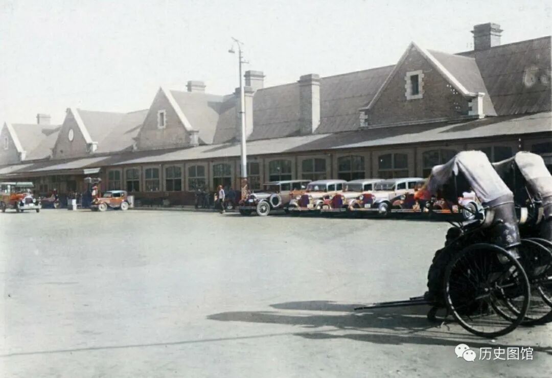 1937年的天津东站面貌。火车站候车大厅,也是西式建筑。门前停放着很多豪华汽车。站前广场上,还有黄包车在等着拉客人。