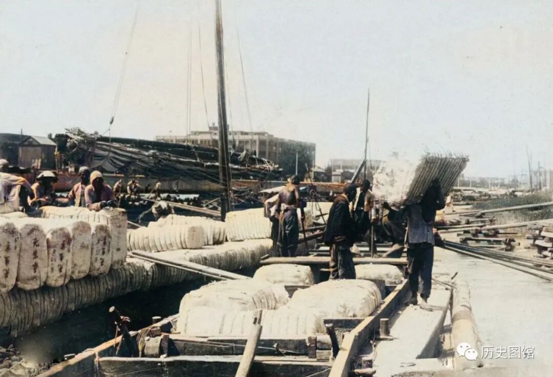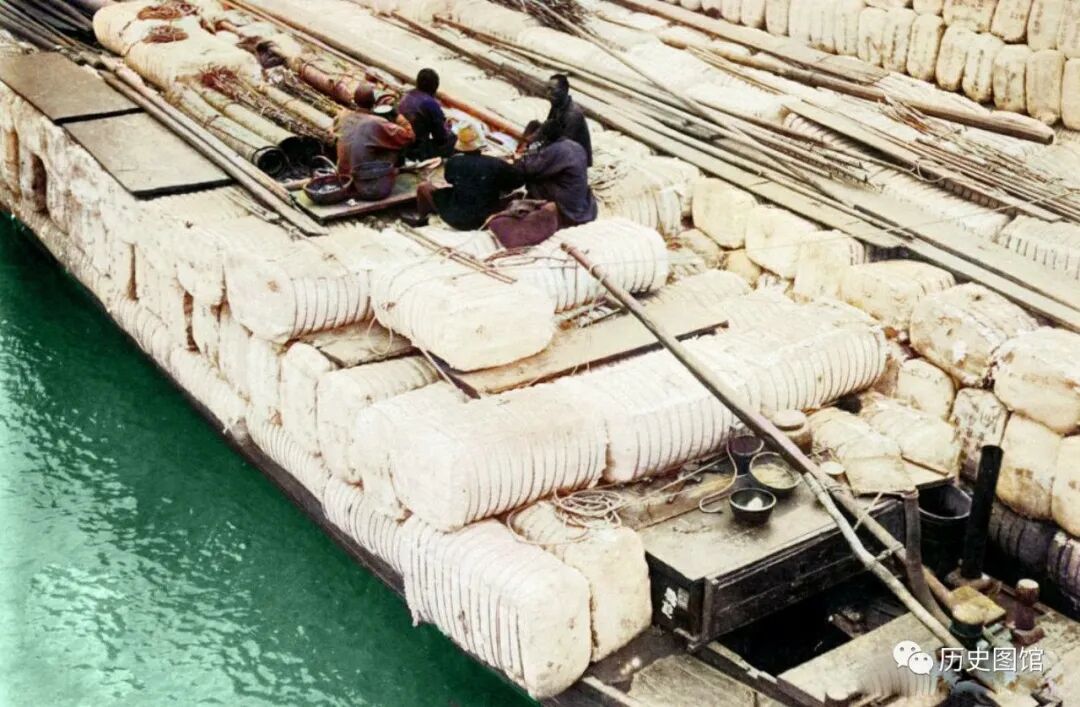 1937年,天津白河。运输棉花的船舶正在装卸货物,码头上一派繁忙景象。一艘装满棉花包的商船上,人们正在吃饭。