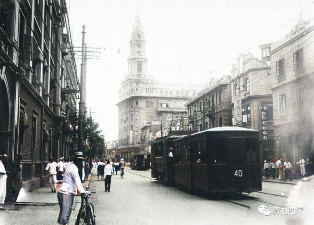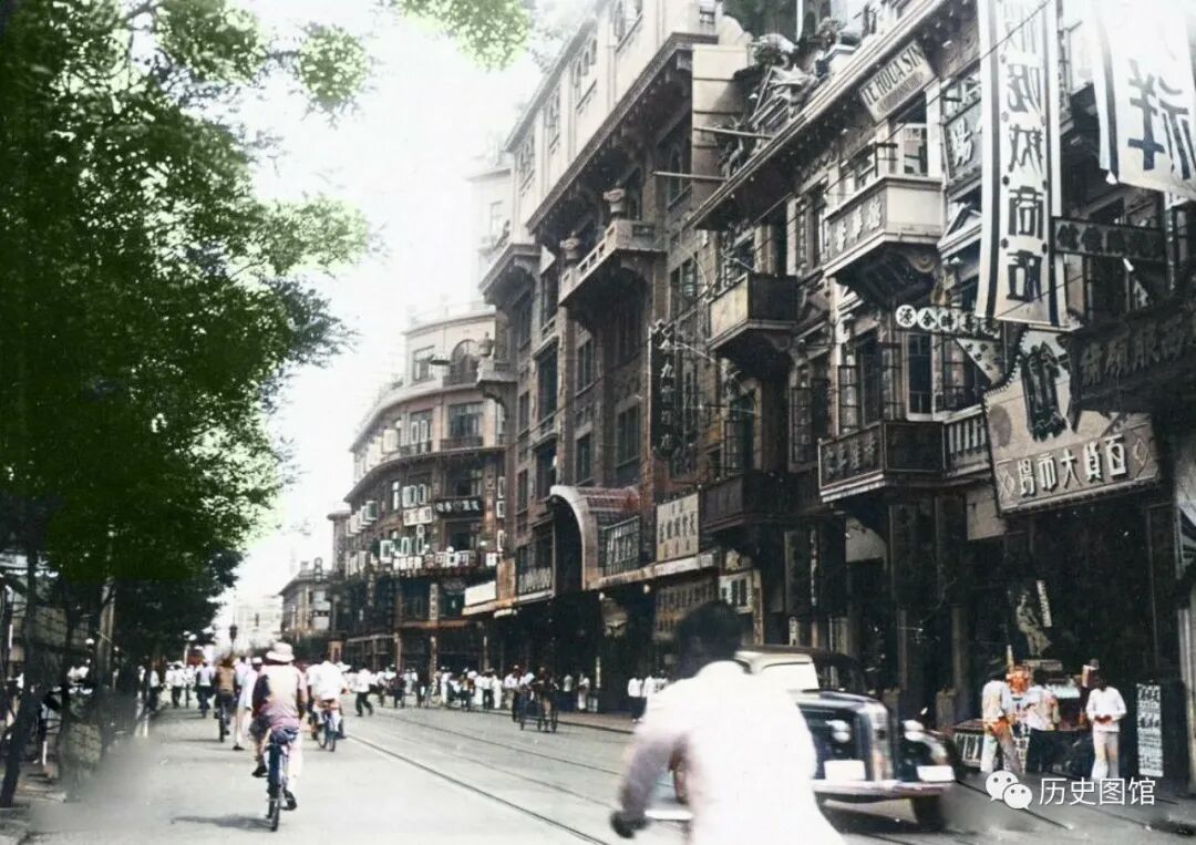 这是当时日本租界内的旭街一带,也就是现在的天津和平路,照片拍摄于1937年。街道两旁也是西式建筑,一辆有轨电车正在驶过。