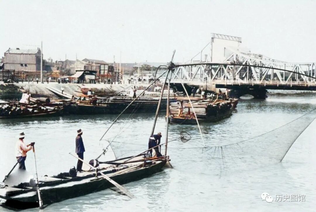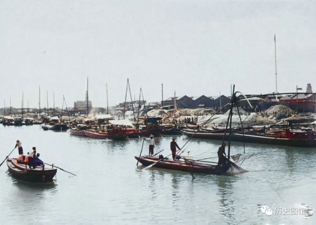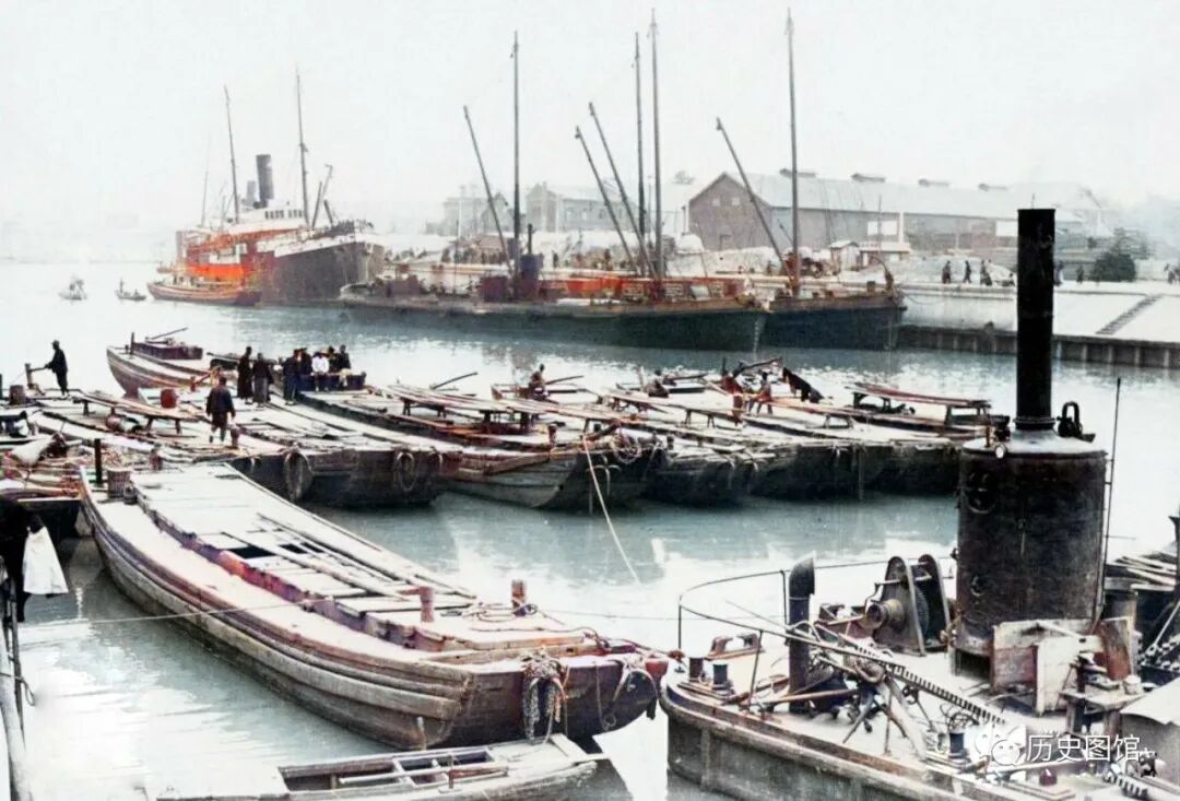这个繁忙的码头,是当时的紫竹林码头,位于法租界。水面上,近处是中国的木质商船,远处停泊的是法国的铁甲轮船。