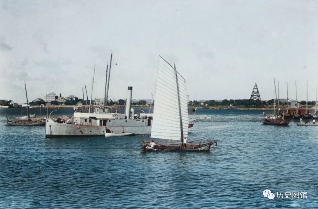 这张照片是1937年拍摄的,位置是大沽和塘沽附近的海河水面。因为河道淤塞,一些大型轮船无法靠岸,只能通过小型帆船接驳。