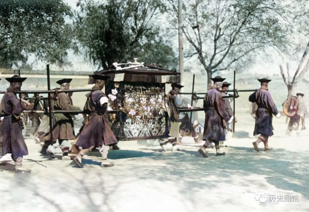 这两张照片,是当时天津的婚嫁队伍实拍。一顶八抬大轿,前后人群簇拥,鼓乐齐鸣。看得出,这是大户人家正在办喜事。