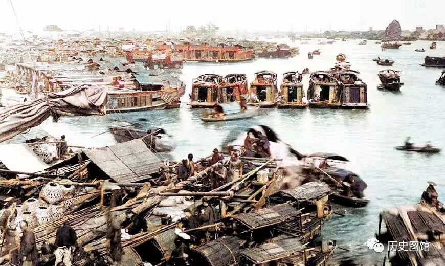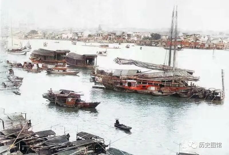 这张照片拍摄于广州,在宽阔的江面上,一条条商船来往穿梭,航运是多么的发达。商业带动文化,中国的传统文化,也通过广东这个窗口传到世界各地。西方的文化也是通过广东传入内地的。