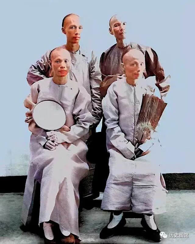 这是广东阳江当地的两名士绅,他们衣着光鲜,手拿蒲扇,一看就是家境殷实。身后站立的两名男子是他们的随从。