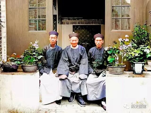 这栋建筑,已经用上西式建筑材料。门前的矮墙上,摆放着几盆花草,开得正艳。直隶厅的三名工作人员坐在门前合影留念。