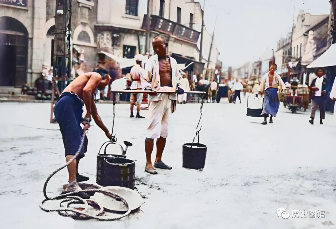 在济南的街头,有一座水井,两名男子正挑着水桶取水。从男子取水用的井绳看,水井比较深。在当时,水井打在街头,是很普遍的现象。