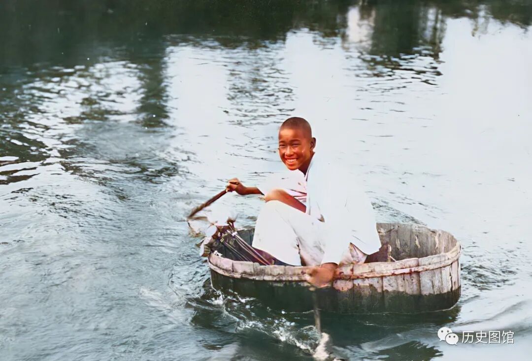 40年代的大明湖上,一名男子正划着盆船在湖里采莲蓬。这种盆船呈椭圆形,像一个大木盆。因为荷叶之间空隙小,大的船出入不方便,人们就发明了这种小巧盆船。