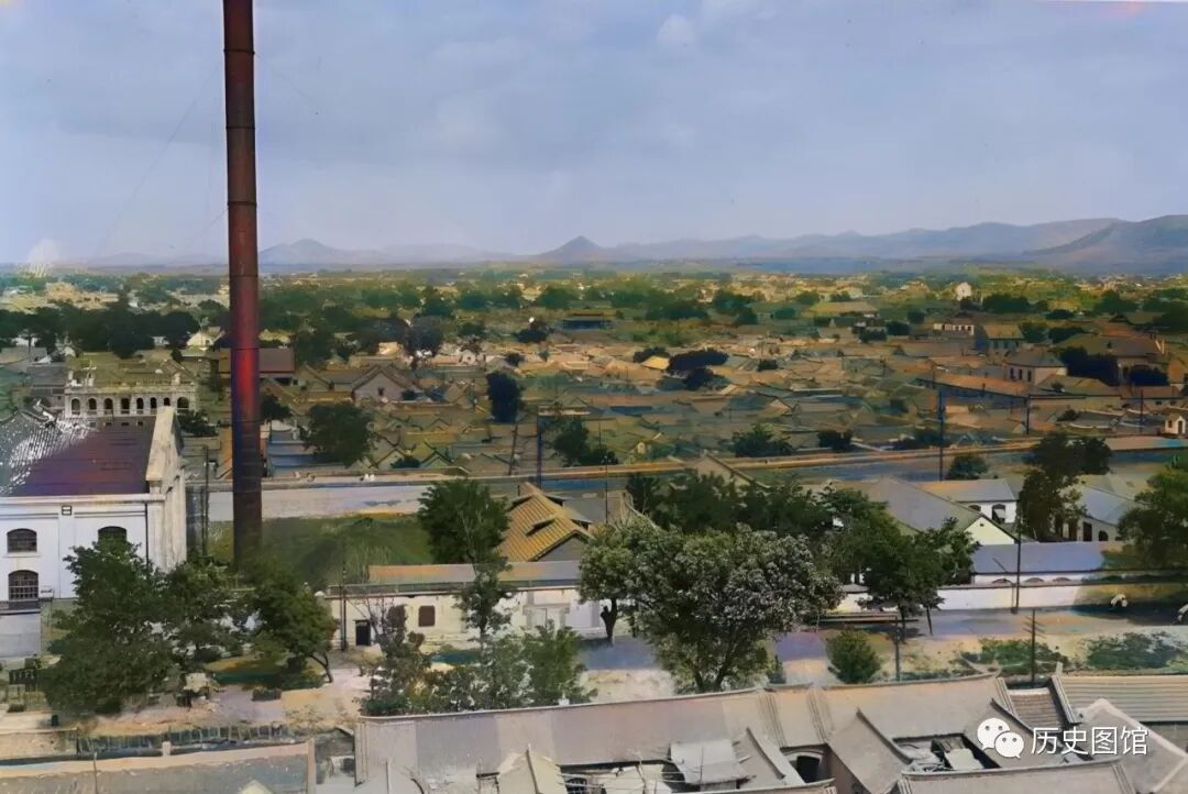如果仔细看,你还能看到济南城的城墙,以及城墙上向外凸出的马面。城墙里面,应该是一个工厂,高大的烟囱顶天立地。城墙外面就是一眼望不到边的民居。最远处,是连绵不绝的青山。