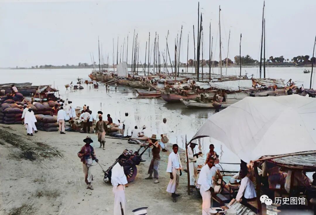 40年代的济南泺口码头,一片繁忙。泺口码头,自西向东依次为上关、渡口、下关三大码头。大小船只停泊在码头上,岸上堆满了等待装船的货物。由于退潮,一些码头工人正扛着货物涉水往船上运。