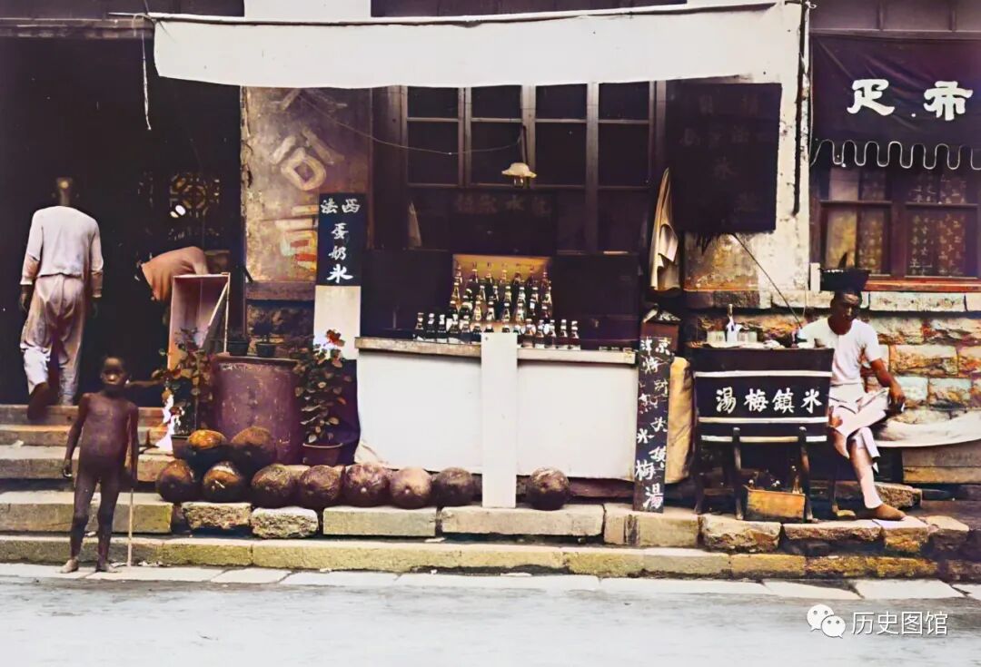 40年代的济南街头,沿街店铺生意兴隆。照片中这个小店,从店门口的招牌上看,应该是一家饮料店。卖的有冰镇梅汤、西式饮料以及椰子等。