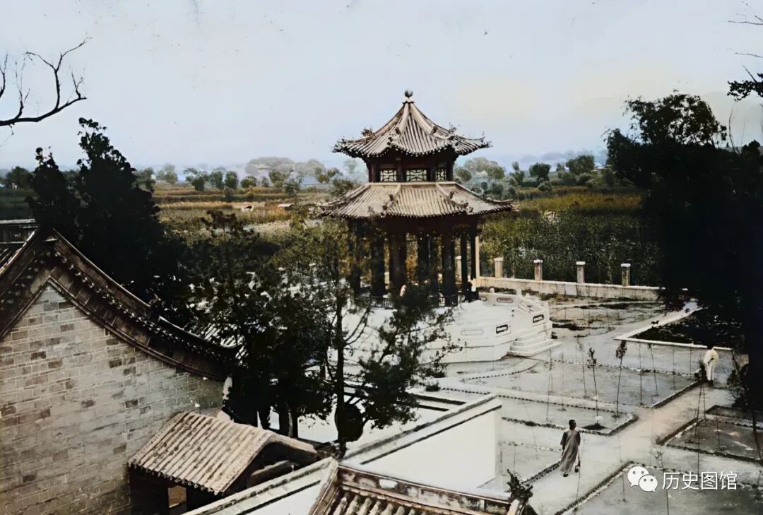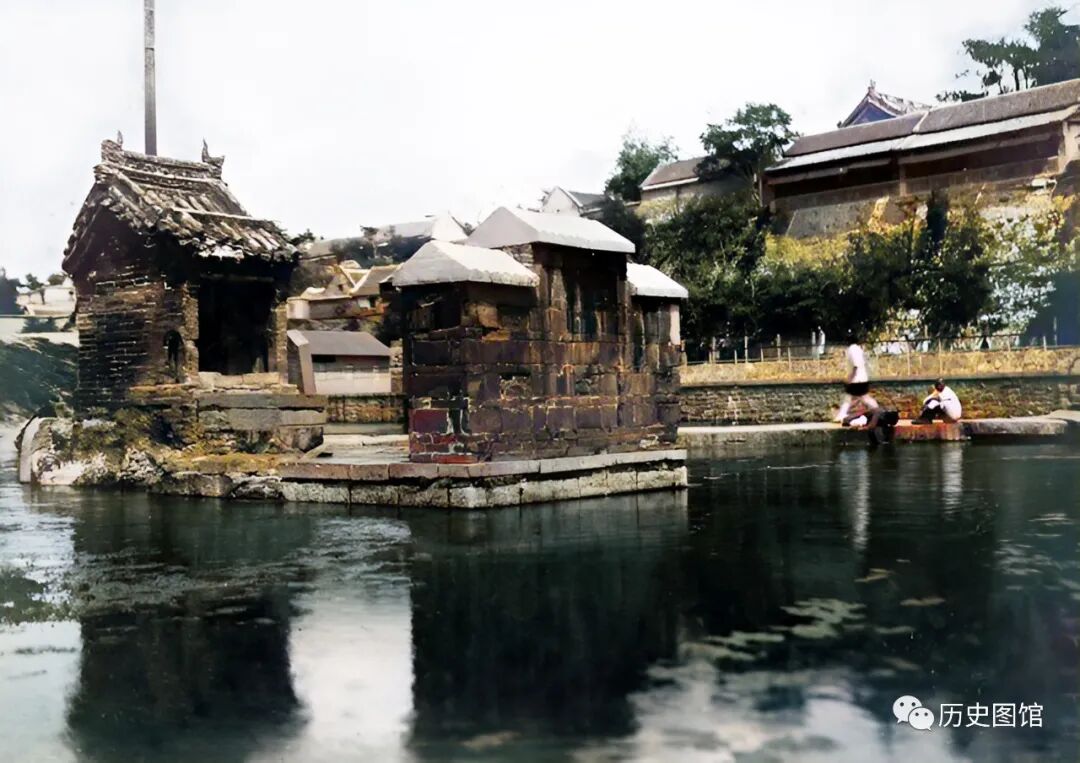 这是民国时期济南的小金山寺,寺庙建在护城河中一块巨大的姜牯石上,只有一人多高,宽一米左右。在寺庙的南侧,还有一面照壁。庙虽小但五脏俱全,可谓是一座“袖珍”小庙。金山寺始建于元代。