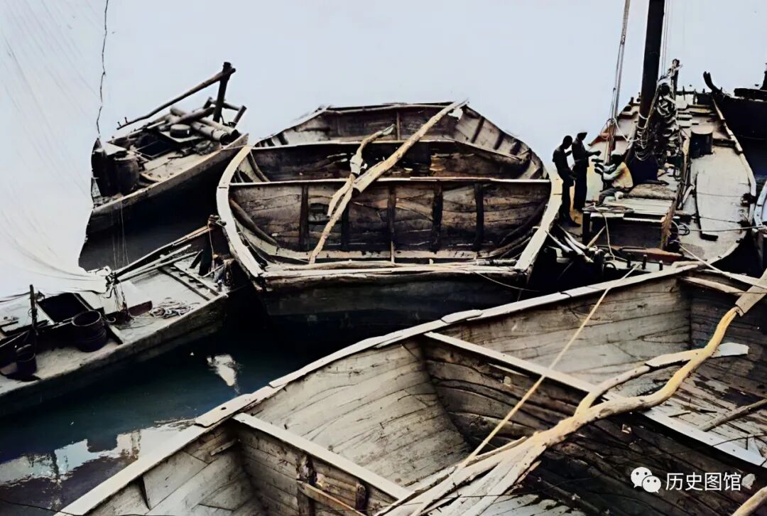 40年代,在济南黄河渡口上,停泊着几艘木船。几名船工正在一艘帆船上聊天。