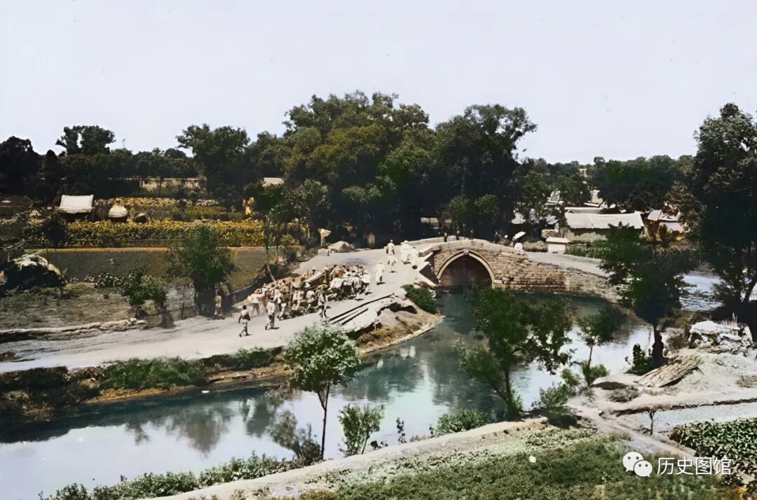 在小河旁的大路上,有一支出殡的队伍。几十名男子抬着棺椁后面跟着的是亲属,他们正在通过河上的一座石拱桥,送亲人最后一程。当时,土葬十分盛行。