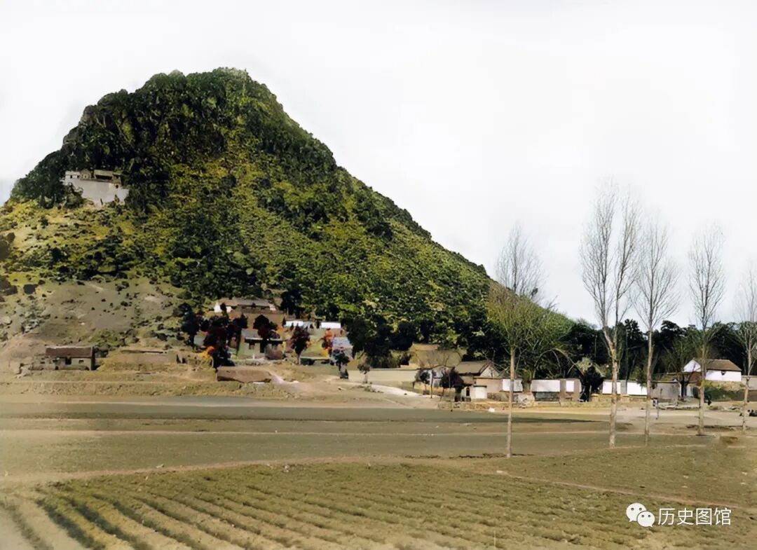照片中这座山十分奇特,孤峰耸立,植被茂盛,山腰和山脚下有寺庙。它就是著名的华不注山,位于济南的东北角。山前是平原,有村庄和大片的田地。