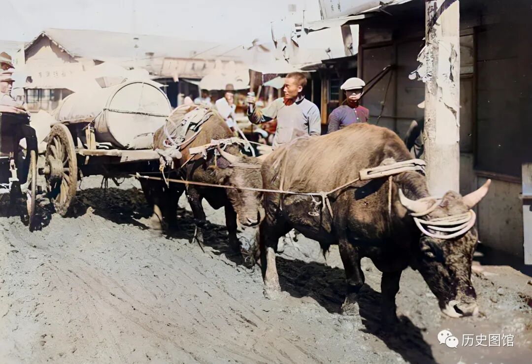 1936年,敦化城内景象。这是一条泥泞的马路,一名男子正赶着牛车从路上走过,后面的马车上,装着由铁皮油桶改装的拉水桶,两头牛使劲在前面用力拉车。