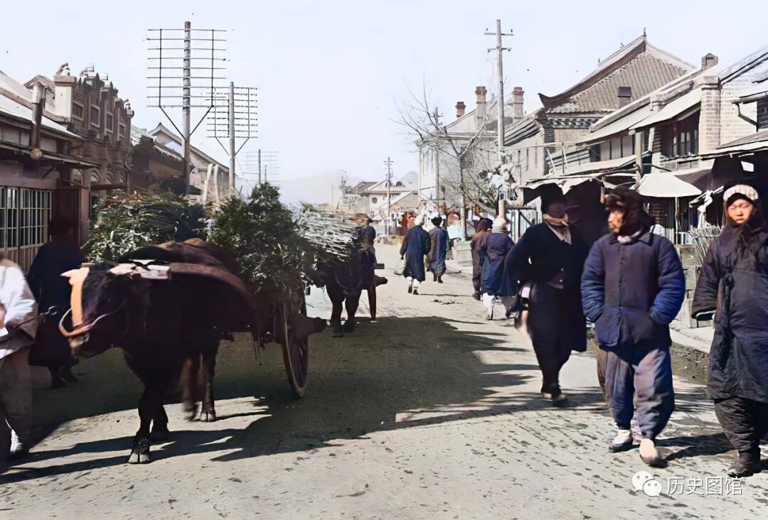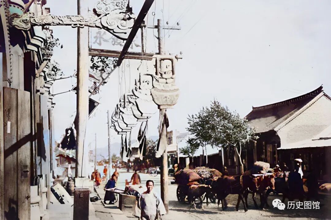 1932年,龙井村(今龙井市)日本街景象。街道不是很宽,两旁的建筑古色古香,店铺都在开门营业。一辆牛车,拉着满满一车高粱杆从街上走过。几名路人回头张望。