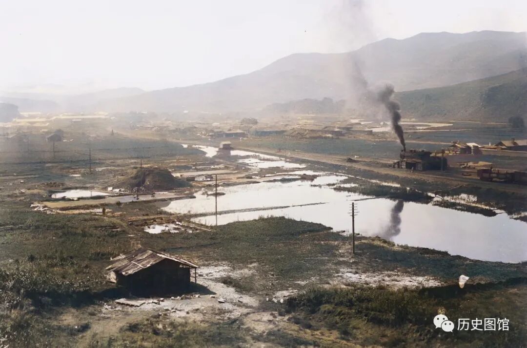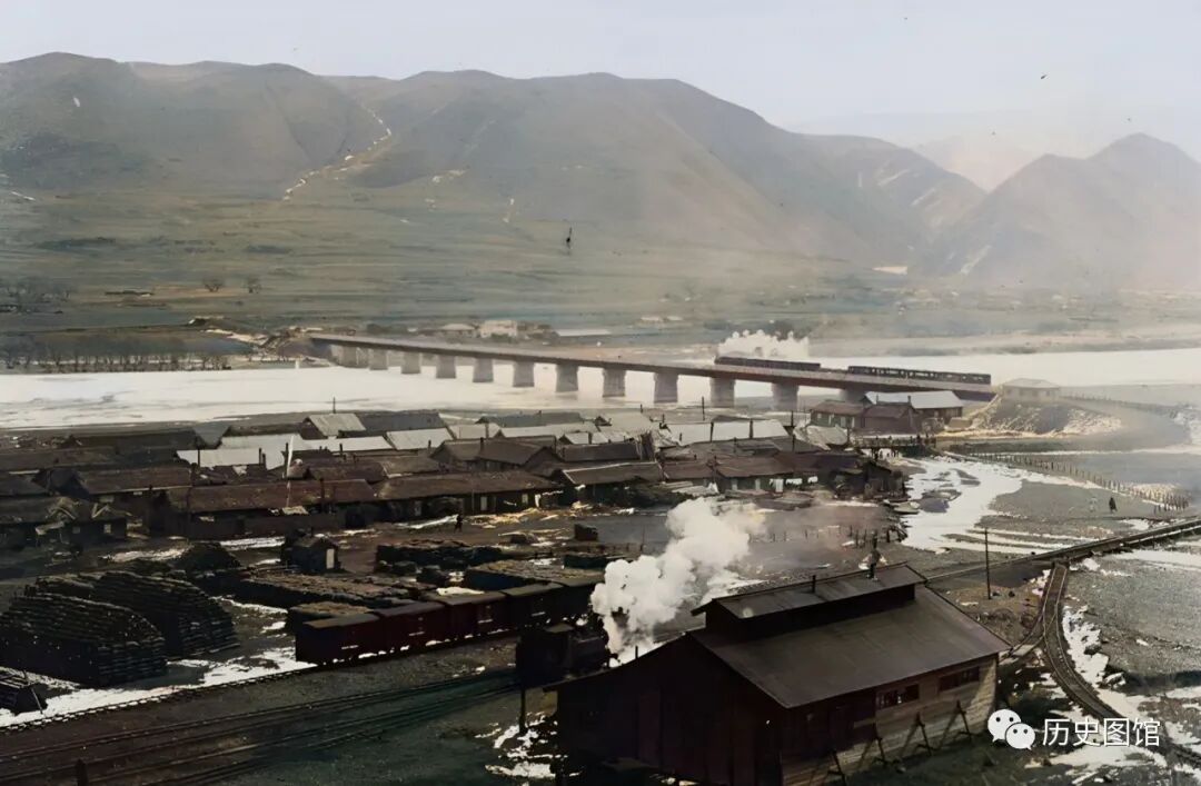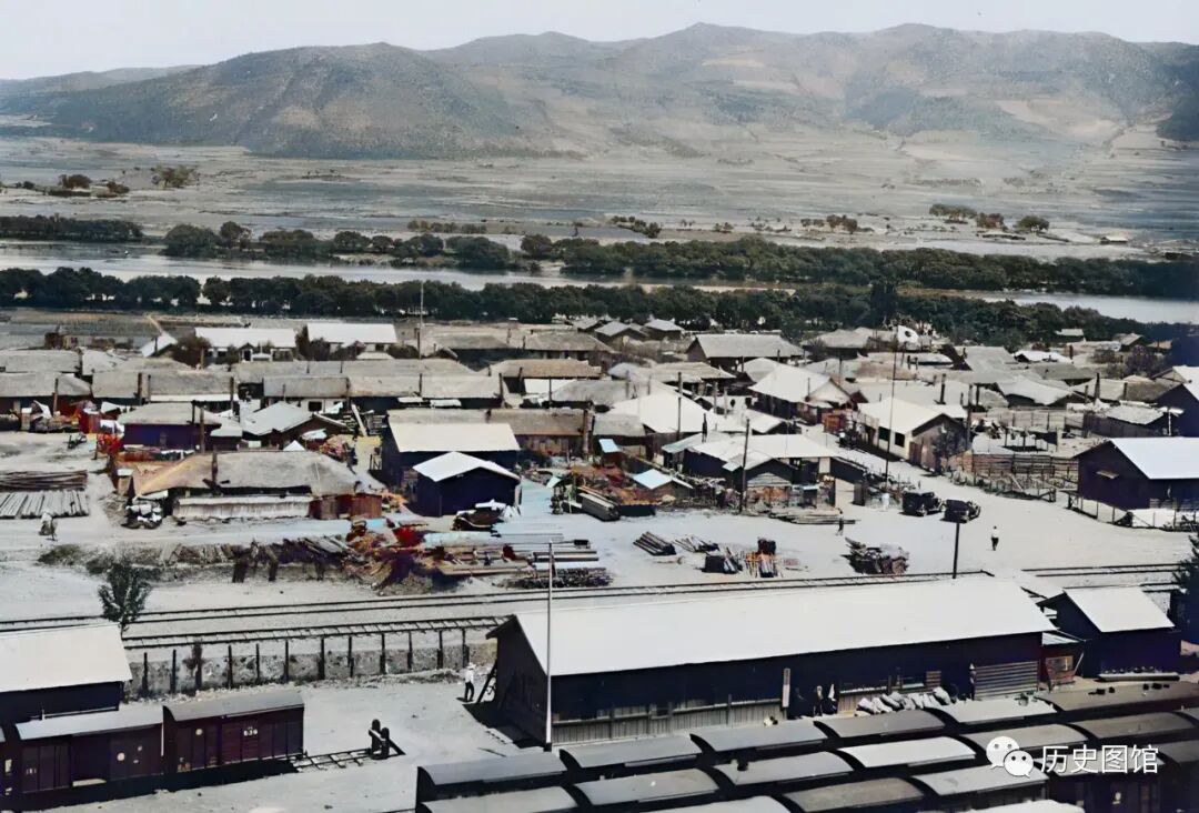 这张照片,拍摄于开山屯(今龙井市境内)。照片中,近处是火车站,能看到站房、铁轨和一节节火车车厢。远处,图们江静静流淌。照片拍摄于1933年。