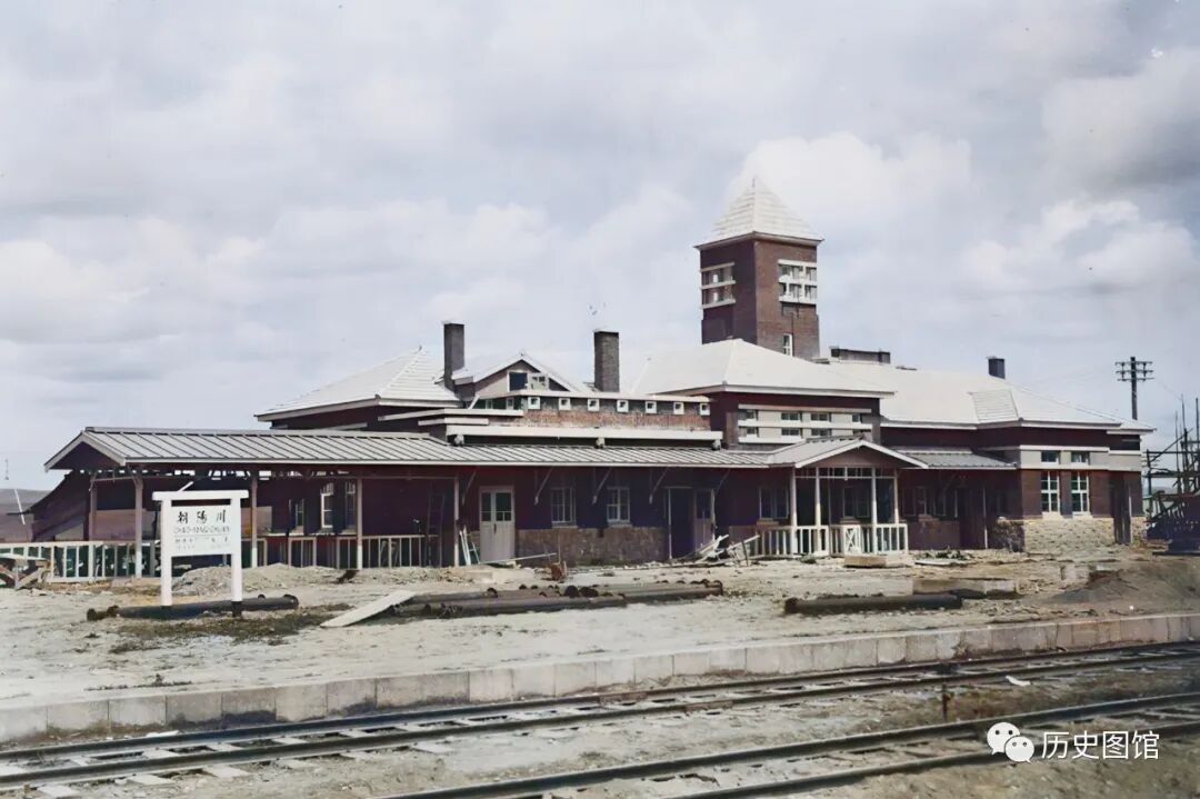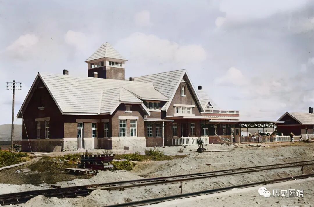 1933年,延吉境内敦图铁路上的朝阳川火车站面貌。站房规模很大,外观也是欧式建筑。站房前有几条铁路线。