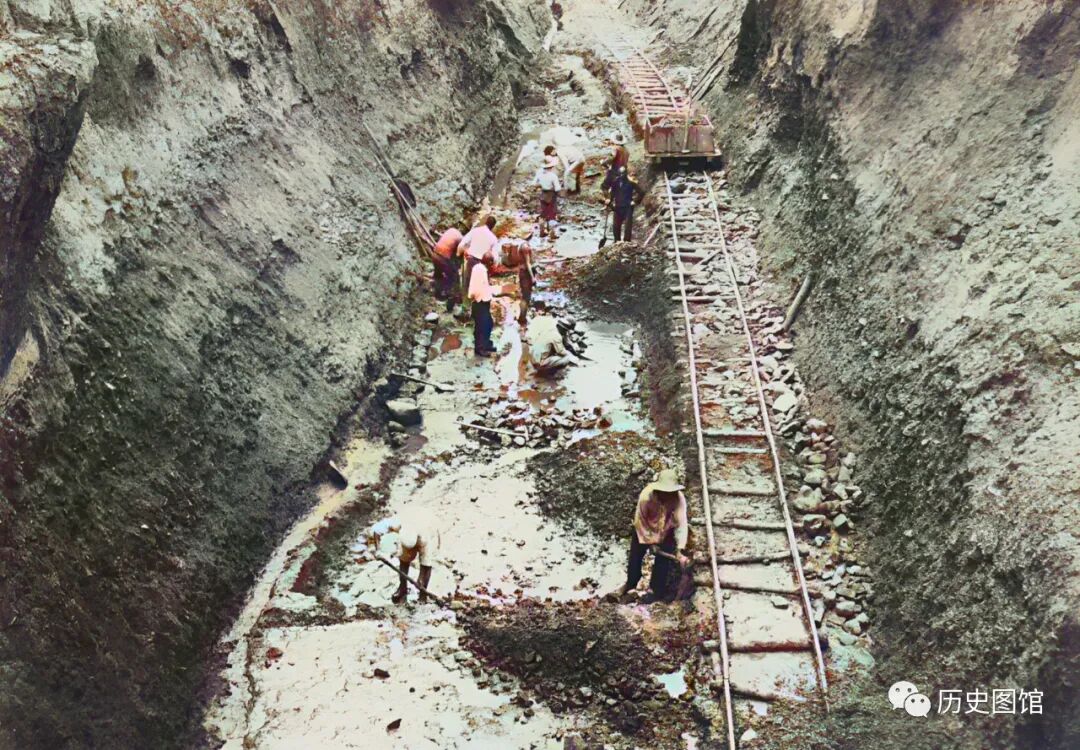 矿坑入口,修建有矿车进出矿坑的铁轨。人们正在挖出的大坑底部工作。这里黄金储量丰富,可惜被日军占领。大量黄金资源被日军掠夺。