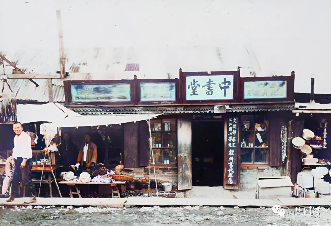 1936年,珲春城内景象。在街边有一家店铺,门头上写着“中书堂”三个大字。门口竖幅牌匾上写着“文教部审定满洲国小学校教科书代理店”。