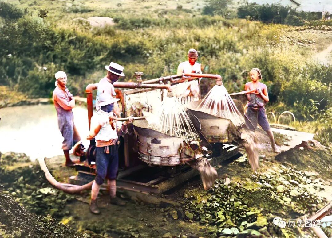 这张照片,也是拍摄于北岔子采金场,几名矿工正在洗矿。一台大型洗矿机在运转,水流冲刷搅拌矿石。比手工淘金效率高出很多。照片中,有一名日军和戴礼帽的管理者。
