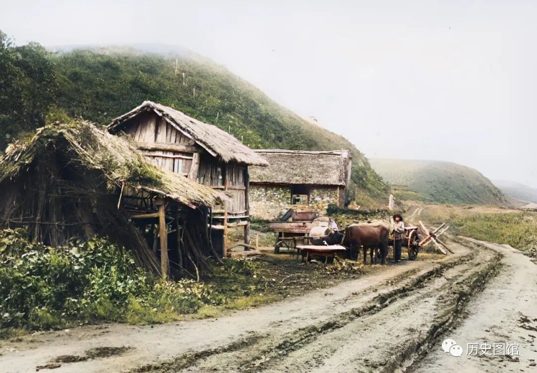这张照片,拍摄于珲春的北岔子附近。一条崎岖的土路伸向远方。路旁,有几间农舍。一名女子正牵着自家的牛,站在碾盘前。