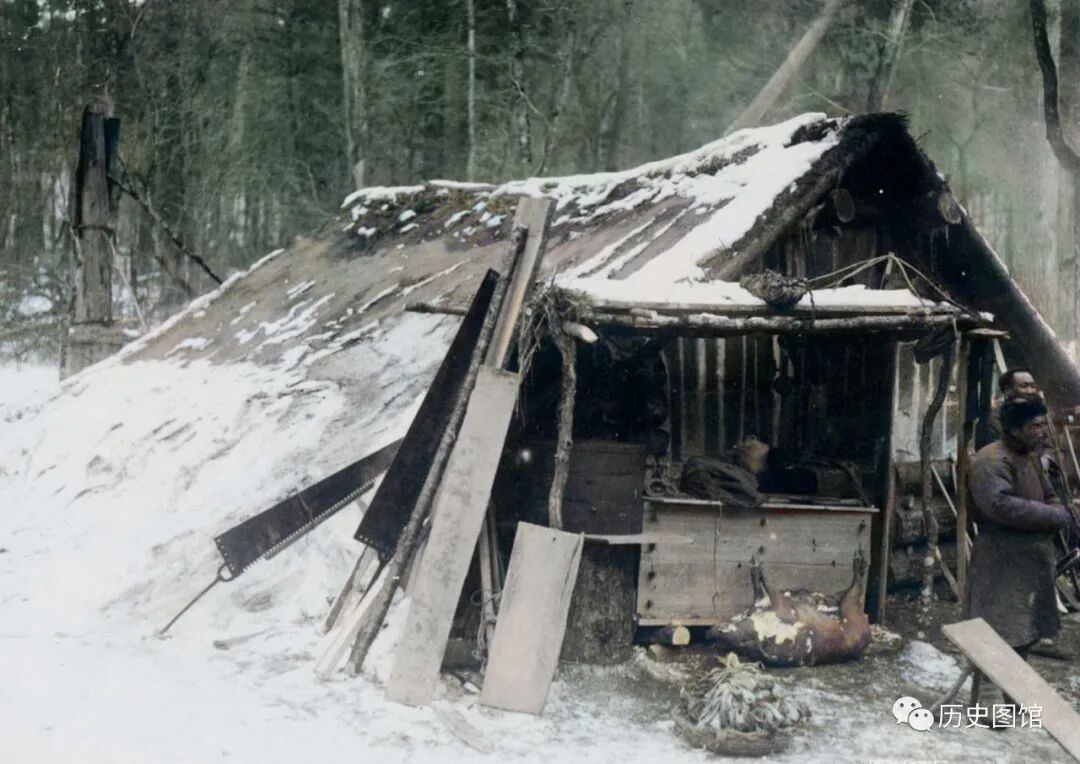 这张照片,拍摄于敦化的森林里。在密林中,隐藏着一间木屋窝棚。这是伐木工人们的住所。积雪还没有融化,窝棚上靠着工人们使用的大锯。