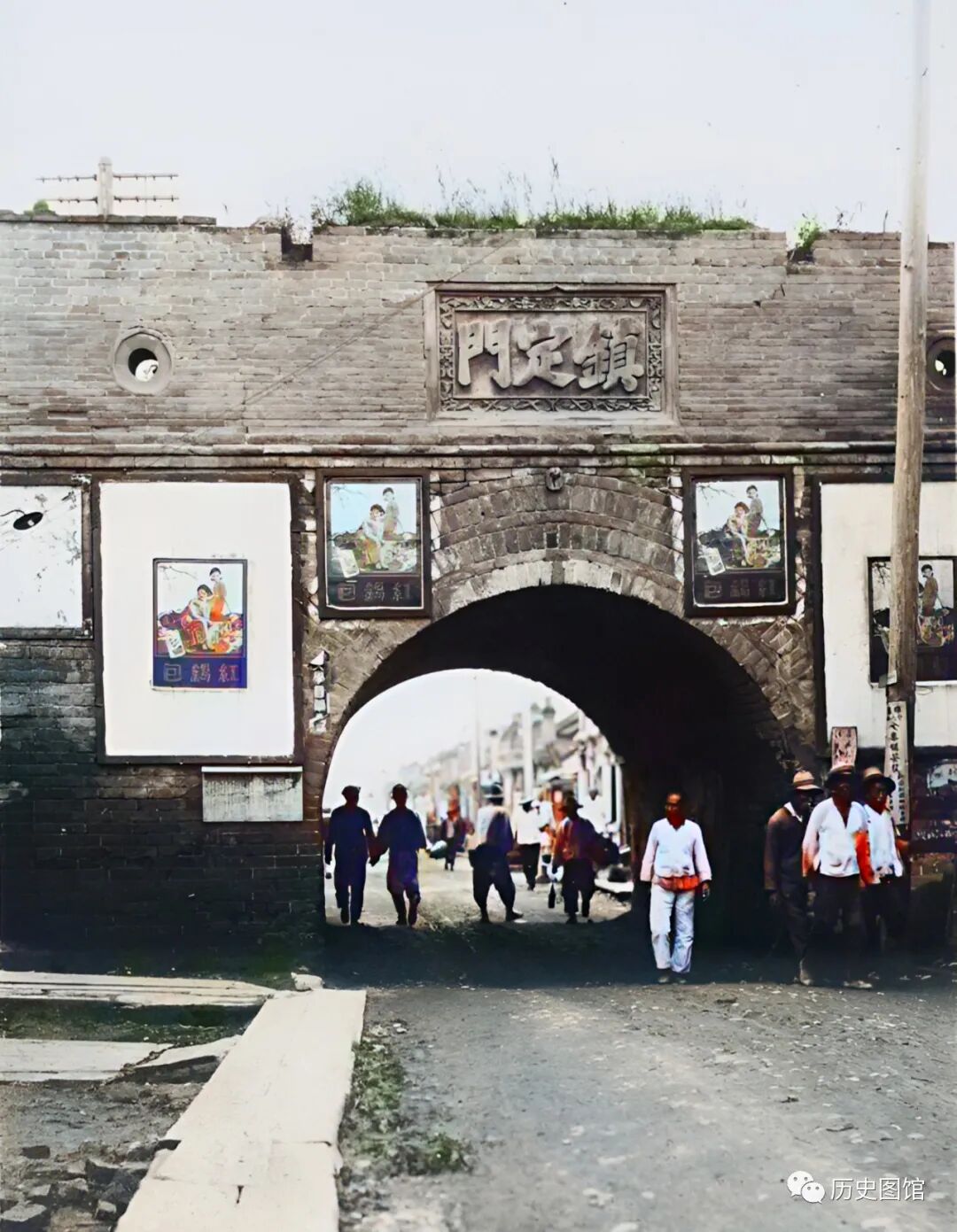1936年,珲春县城的镇定门。高大的城墙用青砖垒砌而成,由于年代久远,显得有些破旧。城墙上也长出了不少杂草。拱形门洞前的这条马路,是进出珲春县城的必经之路。照片拍摄于1936年。