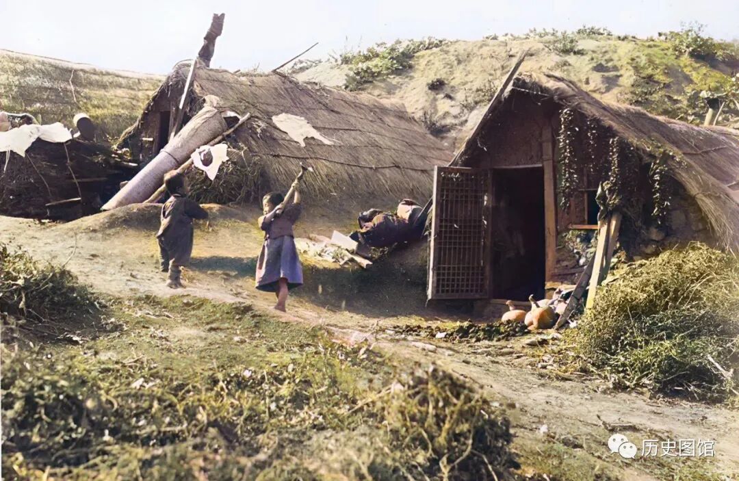 这是位于延吉的一处小村落,房屋为北方特有建筑样式窝棚,是一种半地下的土房子,屋顶用茅草覆盖。两名儿童在房前玩耍嬉戏。房檐下还悬挂着几串大蒜。