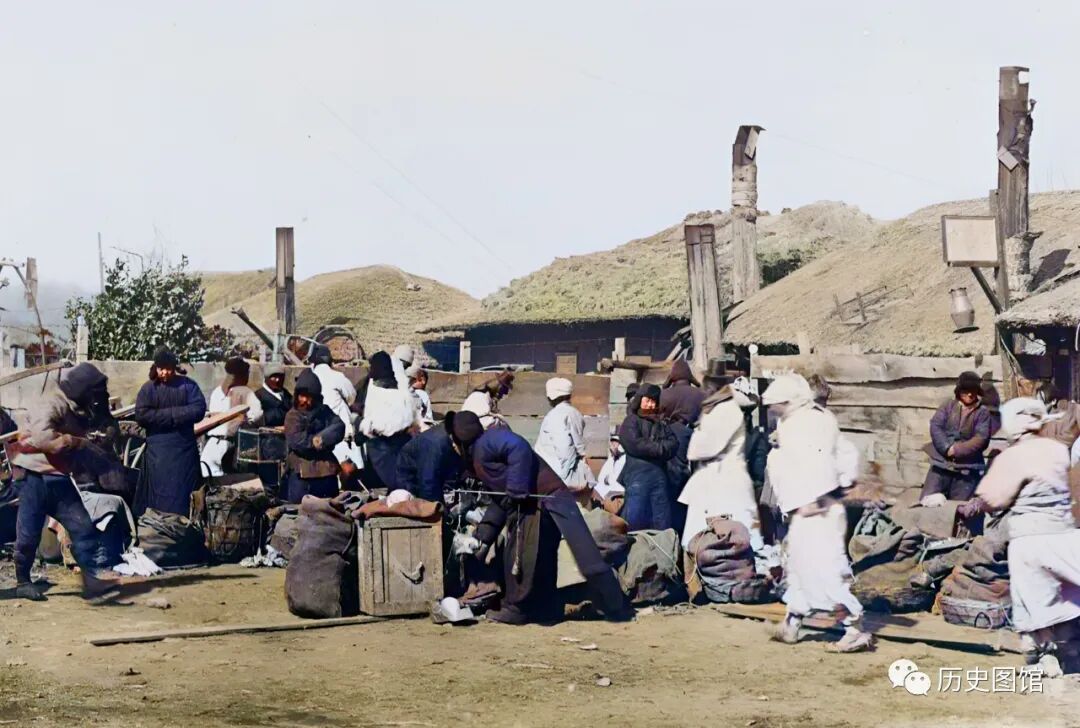 这些小贩们,有的挑着担子,有的拉着板车。在他们身后,还能看到几座农舍草房,高大的烟囱管矗立在房子旁边。这张照片拍摄于1932年。