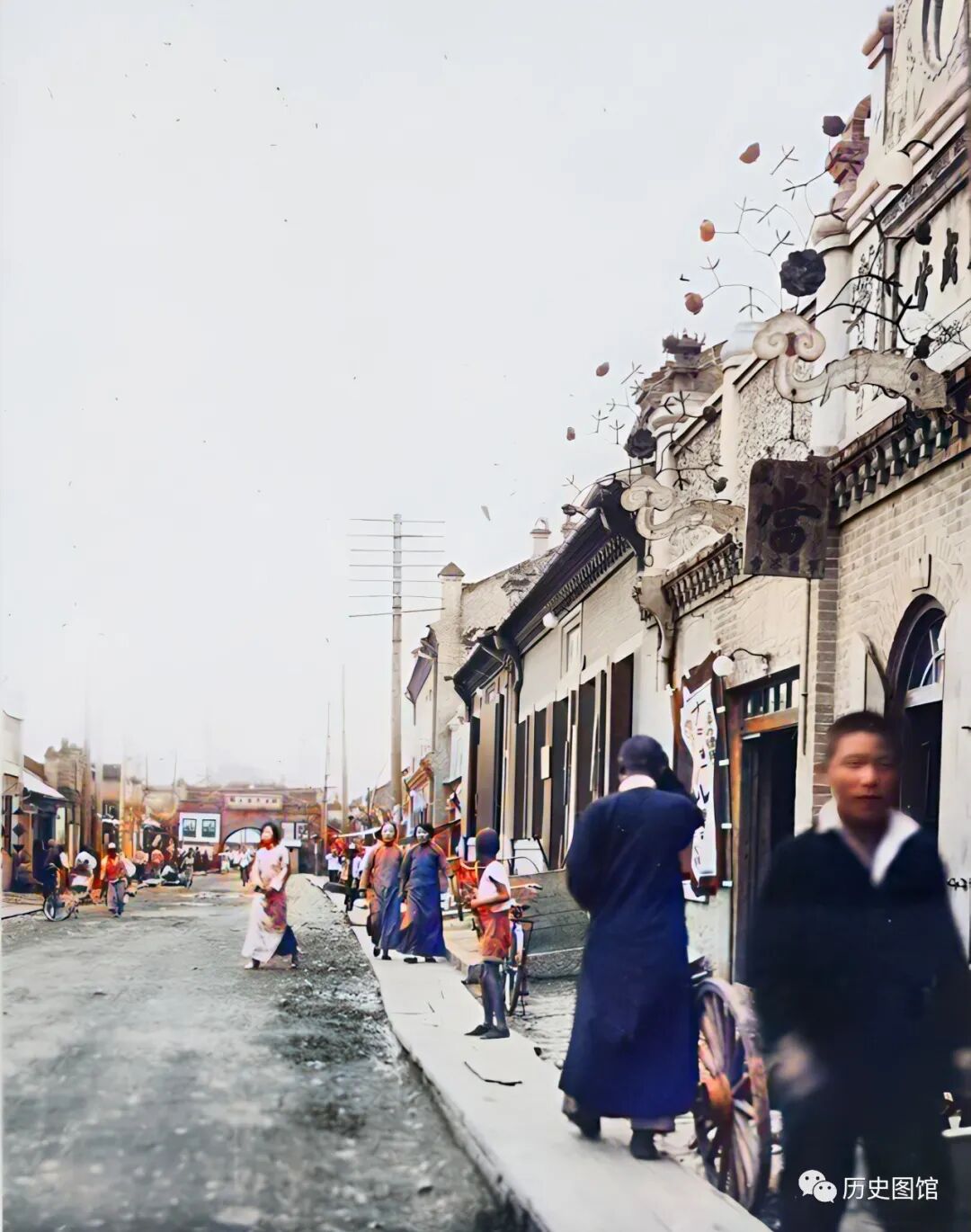 珲春城内景象。画面中是一条笔直的街道,街道两侧是各种类型的商铺,很多人们在街上逛街。远处,高大的城门清晰可见。照片拍摄于1936年。