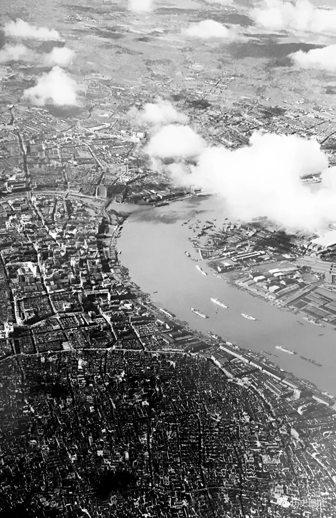 这是卡斯特尔拍摄的30年代的上海,高楼林立,江面上船只来往穿梭,看上去非常繁华。照片前景为南岛,后景为闸北和虹口。当时的拍摄高度为2500米。