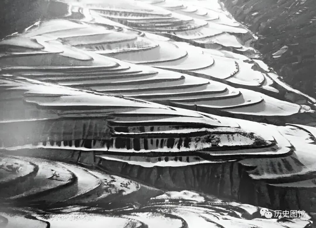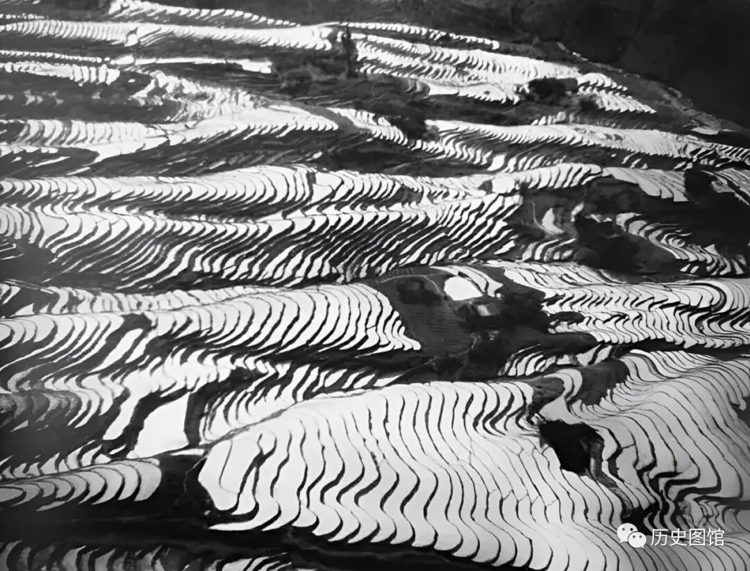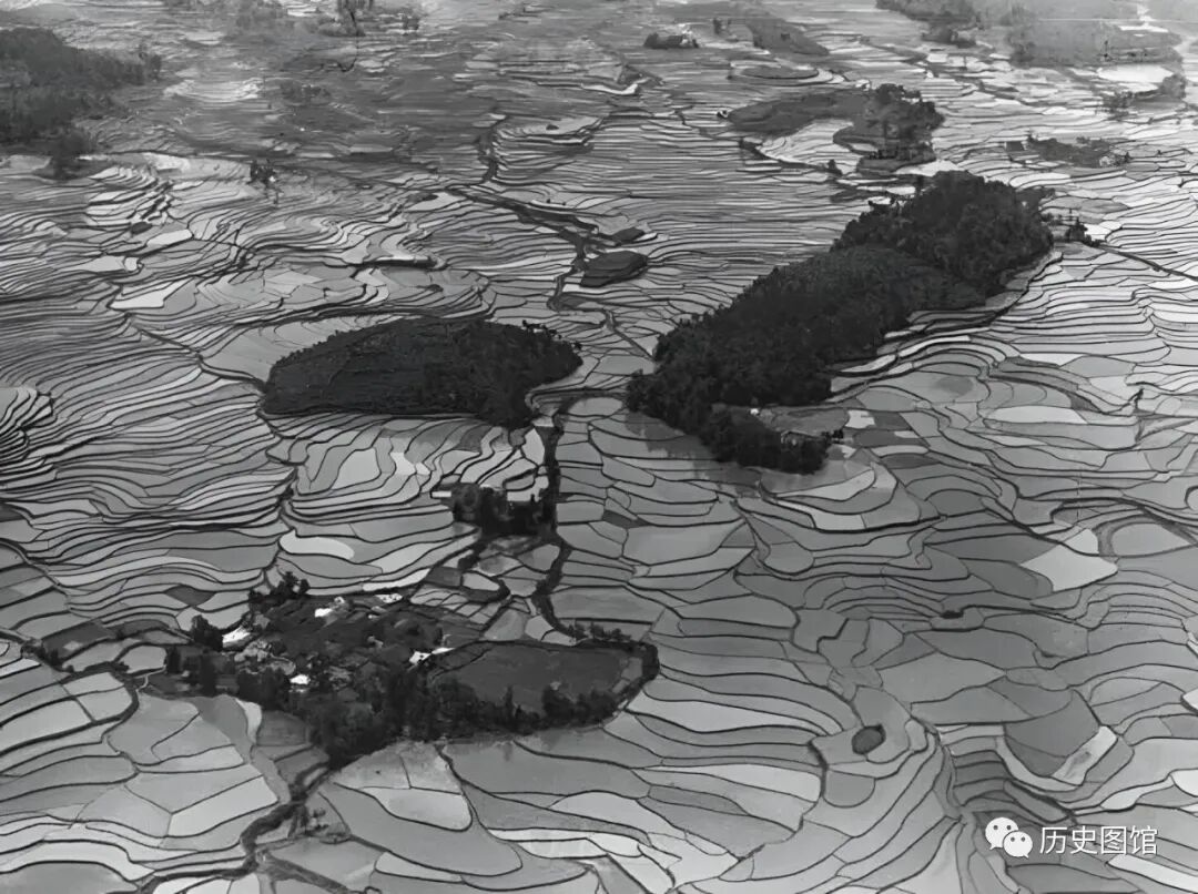 卡斯特尔驾驶飞机,飞越四川南部时看到的情景。山坡上,被一层层的梯田覆盖,圆润的弧线充满了韵律感。梯田里注满了水,映照着天空,像镜子一样。