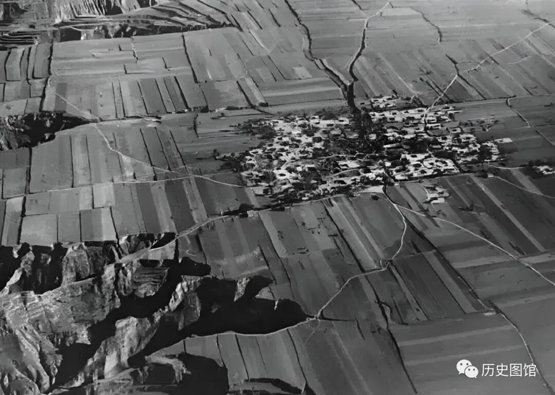 这是河南三门峡境内的一个村庄。从空中俯瞰大地,村子周围的农田里,有数条呈放射状的裂痕,这也是常年水土流失造成的地面奇观。