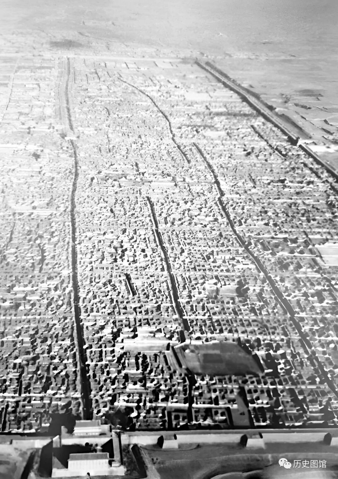 卡斯特尔驾驶飞机进入陕西境内。这是他从飞机上自西向东航拍的的西安古城面貌。当时的西安城楼和城墙还很完整,城内街道一眼望不到尽头。民居如同密密麻麻的小火柴盒一样。