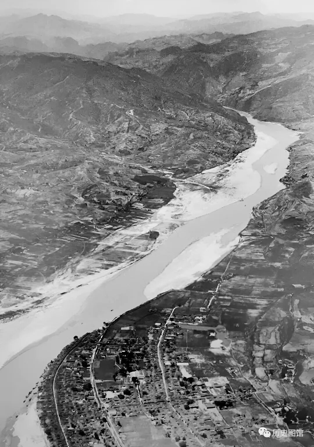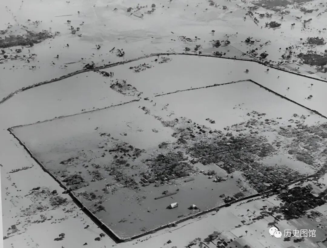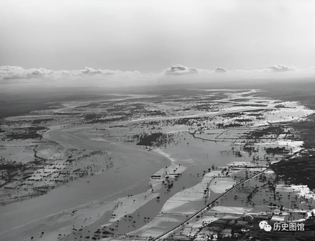 30年代,洛河发生洪水,卡斯特尔驾驶飞机,从东往西俯瞰拍摄下了当时的情景。洛河两岸大部分区域被水淹没。在照片的右下角,有一条铁路,那是郑州-洛阳铁路线。