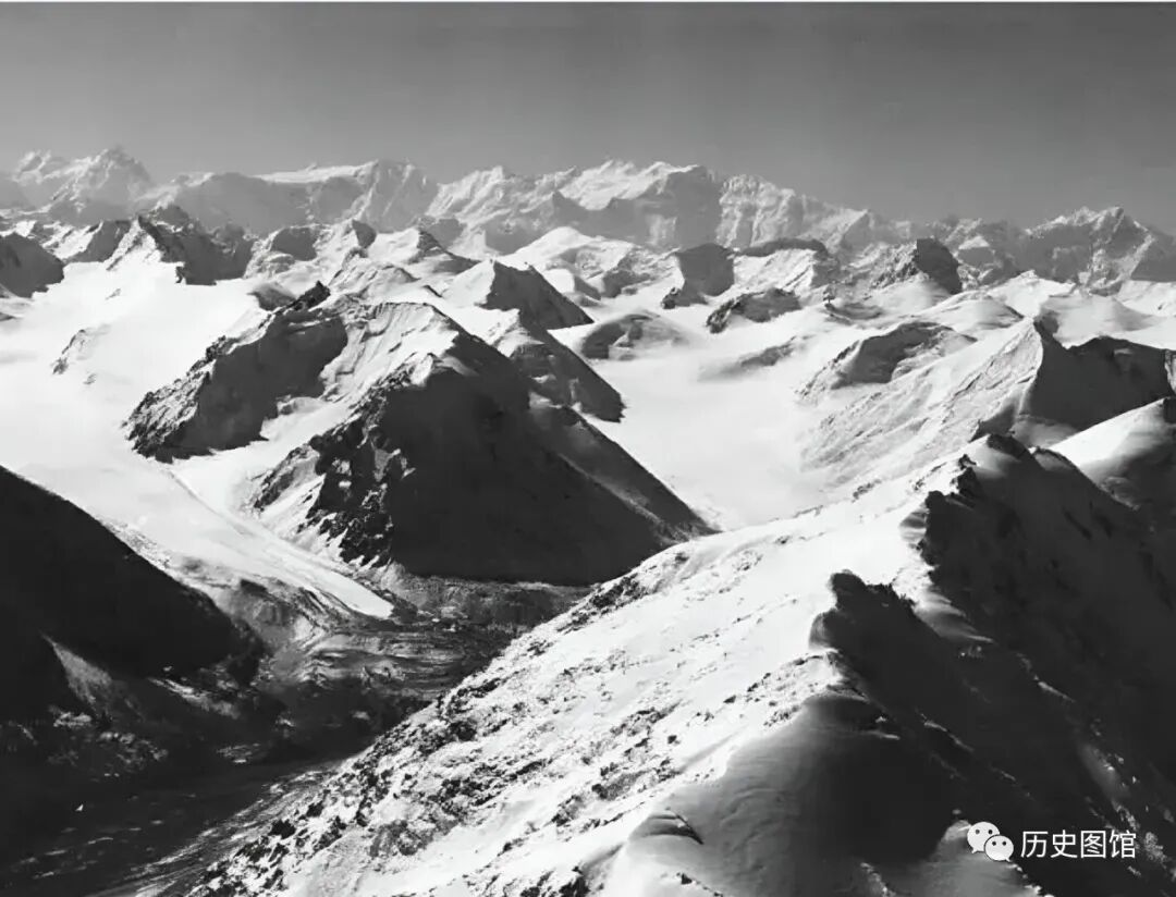 在瓦赫吉尔山口以东20公里处,他把飞机拉高到了6200米,卡斯特尔在飞机上拍摄了一张美景。从这里远眺,远处8000米高的昆仑山清晰可见。